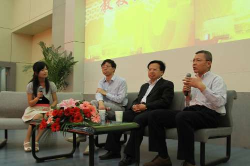 活动第二篇章通过教授访谈方式娓娓展开,王成华教授、周建江教授、曹群生教授作为访谈嘉宾接受了主持人和现场观众的提问。三位知名教授代表分别结合自身发展、受教育背景、学习成长经历以及对教育教学的认识等向现场观众剖析问题,答疑解惑。教授们语言诙谐,深入浅出,对同学们比较关注的合理使用电脑问题、就业问题、出国问题等通过故事结合经验具体阐述,并对同学们的发展提出了真诚的期许,整个访谈节目在轻松的氛围中不断掀起高潮。