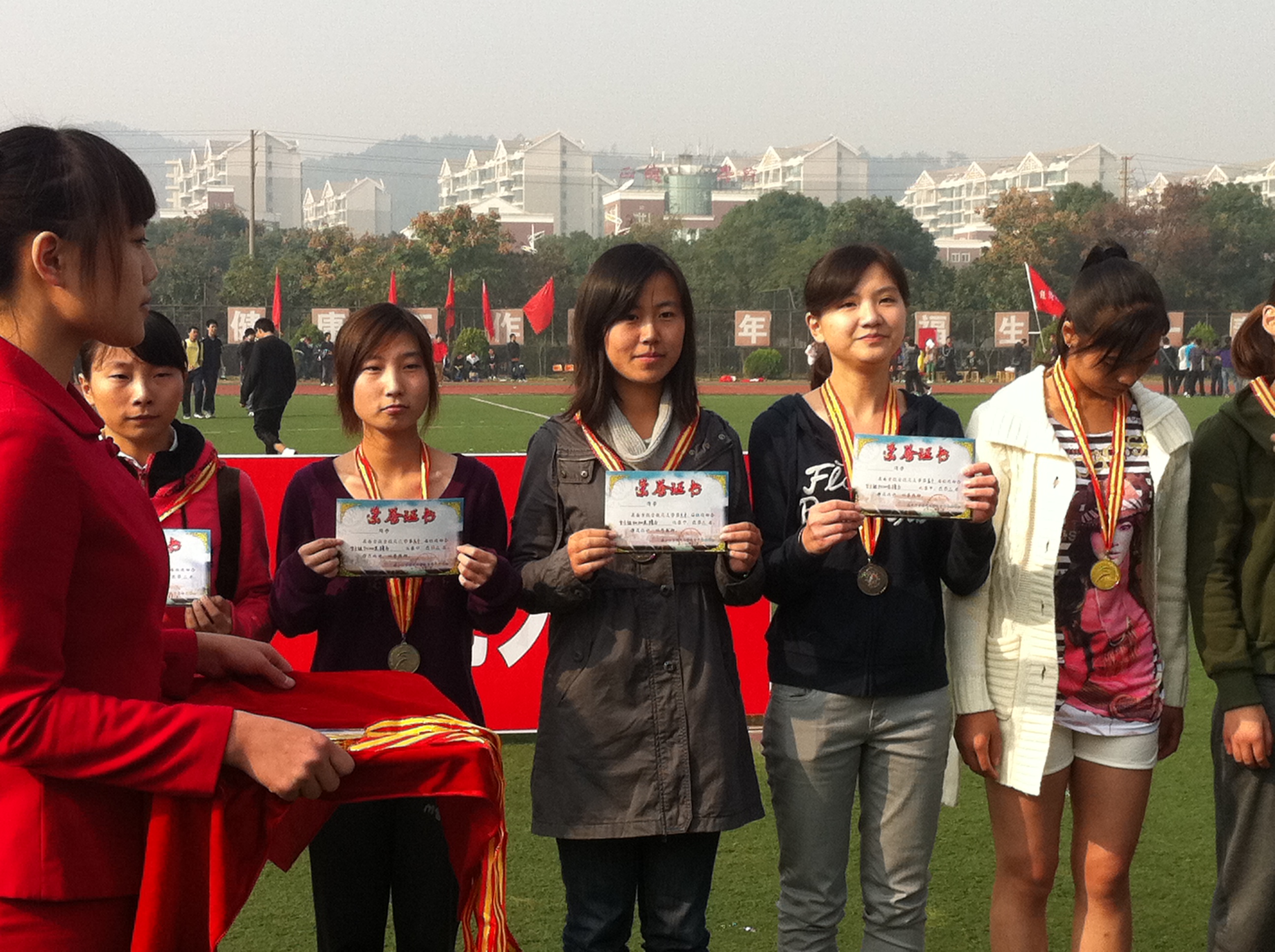 在入场式方阵表演中,我院代表队将信息与健康理念相融合,“翠屏凝气秋点将,四院争先试锋芒”的豪言壮语在两枚氢气球的牵引下冉冉升空,成为会场一大亮点,为我院赢得第三名的好成绩。在接下来的竞技比赛中,运动员们不负重望,“志在超越”展现着他们的积极心态,“为院争光”蕴含着他们的集体主义情怀,“贵在坚持”深含着他们乐观向上的情操。师生接力比赛中,在学院党委副书记季海群老师的带领下,何小祥、张晓燕、高清军、杨紫园老师积极参与,展现了我院师生昂扬向上的精神风貌。在运动员们的共同努力下,我院女子团体取得突破,获得了校第六的好成绩,同时我院荣获最佳组织奖。