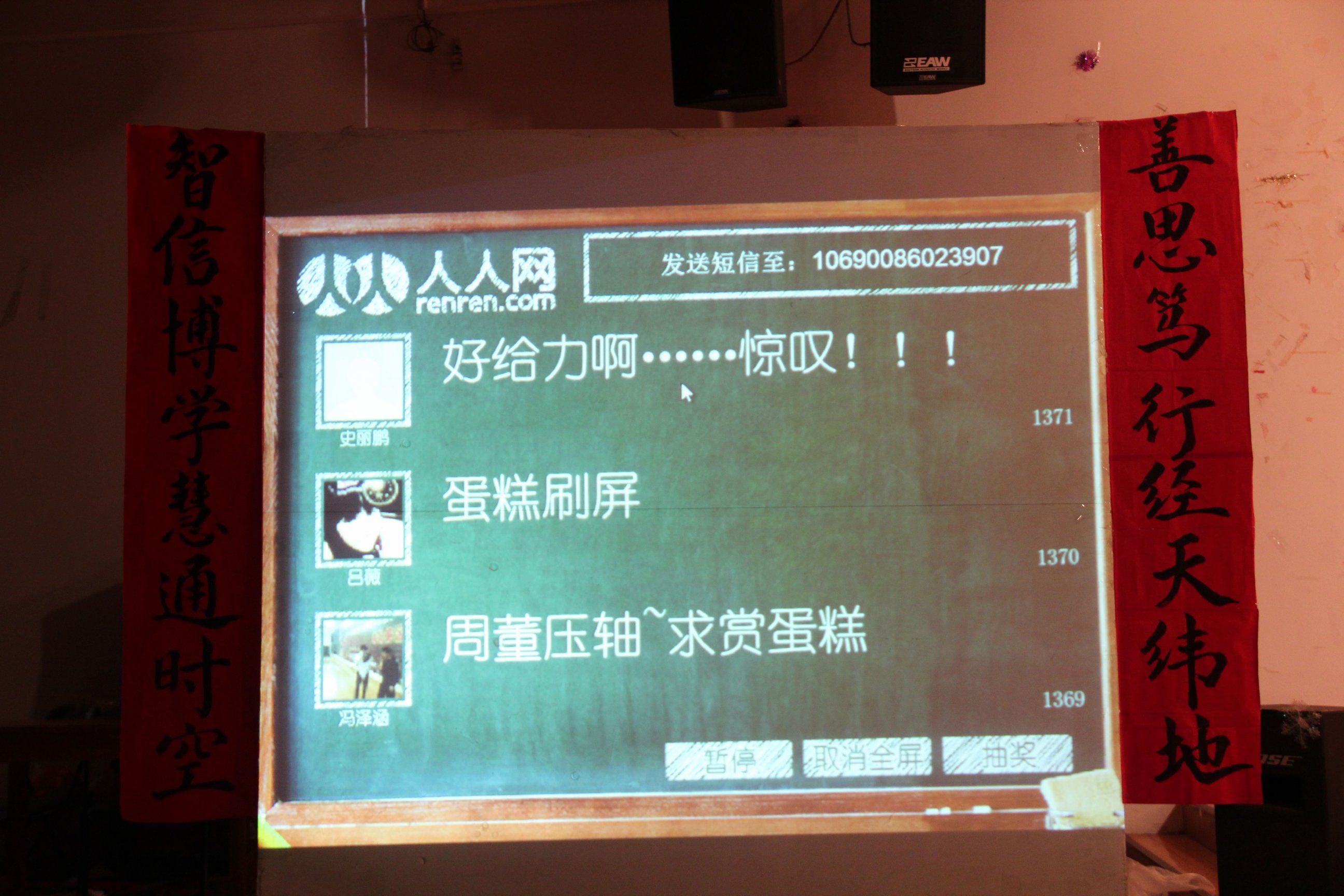 本次晚会进行了人人网的同步更新,同学们积极踊跃的把自己的祝福通过网络发布到活动现场搭建的人人墙上。不停更新着的留言,诙谐幽默,不仅带动了全场的气氛,更将大家的祝福传递给现场的每一个人。
