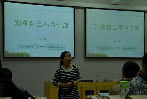 讲座着眼于学生干部准确的自我定位和自身境界的提升,以《别拿自己不当干部》这部电影所折射出的干部相引入,让现场同学们勾勒出学生干部众生相,从而提示同学们经常做自我反思,温故竞选时的信心满满,审视自我定位和工作目标;通过列举往届优秀学生干部代表的事例,明确指出了学生干部自身素质对于学生工作的重要性,为同学们树立了榜样,以此激励同学们不断提升素质,有能力为所在集体作出贡献。讲座最后播放了励志短片,同学们通过泰国著名足球俱乐部建立的故事体会到敢想敢做就会有所收获。