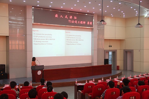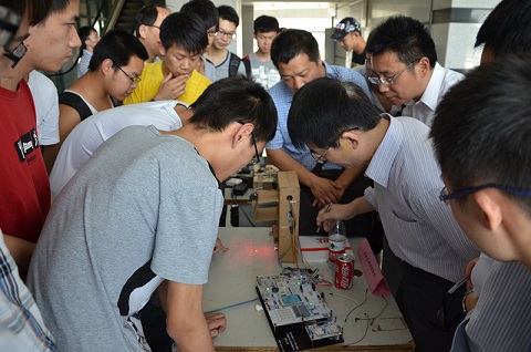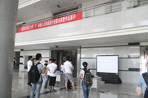 决赛暨作品展示于下午2点在将军路校区主楼大厅举行,各参赛队伍分别向评委老师展示了自己作品的功能及原理,评委老师认真询问关于作品的细节问题,现场气氛紧张热烈而又不失秩序。同时,由TI公司工程师带来的嵌入式讲座也在主楼报告厅举行,现场座无虚席。