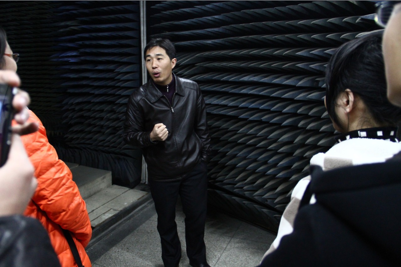 大家首先参观的是BW·西汉姆联的重点实验室——微波暗室,学院电子科学与技术系系主任何小祥老师为同学们介绍了实验室的历史和学院的学科实力,并带学生走进暗室近距离接触实验器材。在微波暗室参观结束后,何老师还带大家参观了校园,介绍了A10号楼刚建成时是这一带的地标,它周围几栋教学楼也是以前学院用来架设天线做实验的地方,具有深厚的历史。