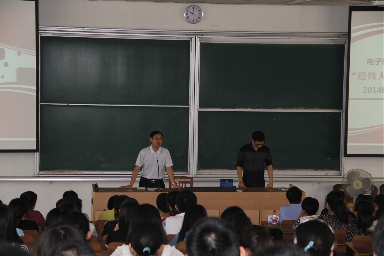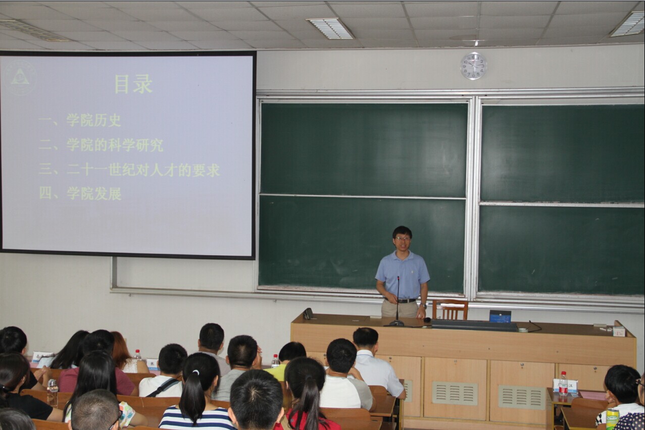9月4日上午,我院“经纬人生,追梦远航”2014级新生见面会在将军路校区4101教室举行。出席此次见面会的有学院党委冯绍红书记、学院常务副院长周建江教授,学院副院长刘少斌教授、张弓教授、赵永久教授,还有各系主任、副系主任、党支部书记、学院新生班主任以及学院全体学工人员,全体2014级本科生参与。本次新生见面会由学院党委副书记季海群主持。