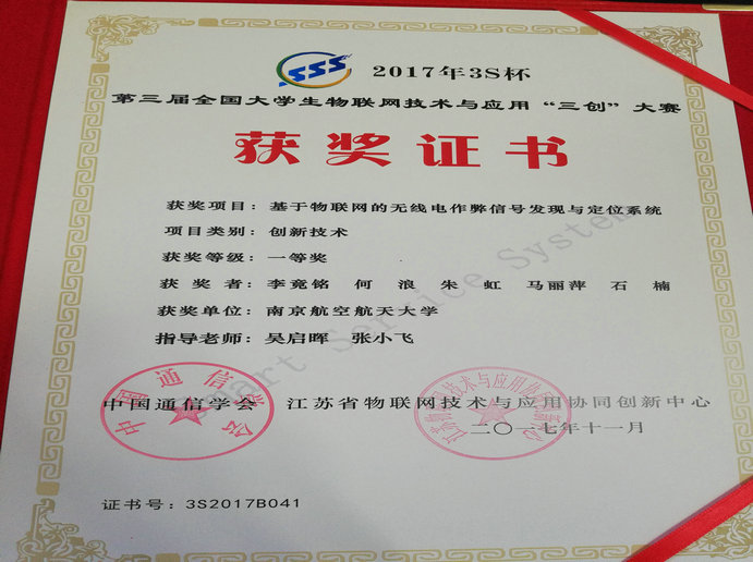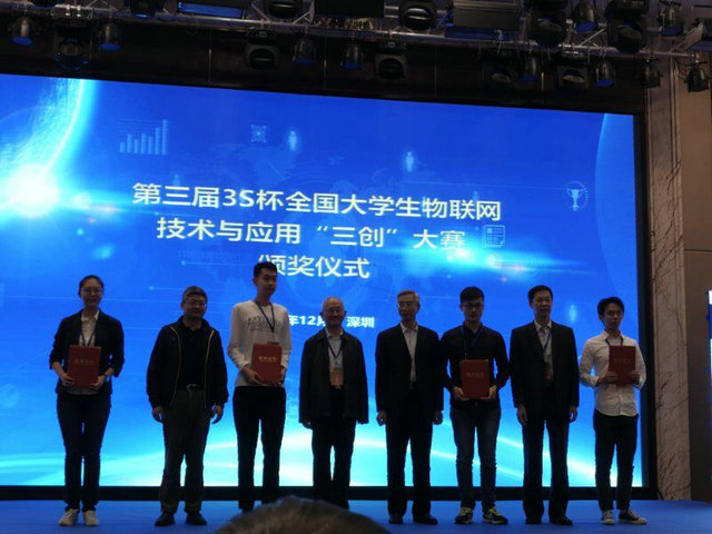 2017年11月17-19日,互联网+众创论坛暨第三届3S杯全国大学生物联网技术与应用“三创”大赛决赛在南京举行。本次大赛由中国通信学会、江苏省物联网技术与应用协同创新中心联合主办,中兴通讯股份有限公司、华为技术有限公司联合协办。我院长江学者吴启晖教授、张小飞教授指导我院李竟铭、何浪、朱虹、马丽萍、石楠五位学生在 463个参赛队伍中过关斩将,最终获得一等奖。12月2日,在深圳召开的 “全国物联网技术与应用大会(CIoT 2017)”和“全国无线电应用与管理学术会议(CRAM 2017)”上,举行了第三届3S杯全国大学生物联网技术与应用“三创”大赛颁奖仪式。中国工程院院士倪光南、薛禹胜、于全,中国科学院院士尹浩,为我院一等奖获奖者颁奖,大会还为获奖项目进行了展示与交流。