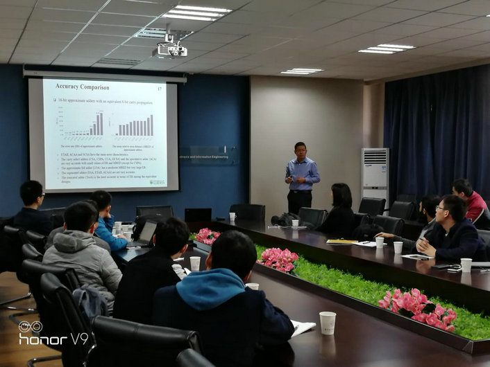 2017年12月25日-26日,加拿大阿尔伯塔大学(University of Alberta)韩杰教授应我院电子科学与技术系副主任刘伟强副教授的邀请访问BW·西汉姆联,做了题为“Approximate Arithmetic Circuits and Their Applications”的学术报告。报告首先介绍了可容错计算的发展历程,引出了近似计算的必要性。随后韩杰教授详细介绍了目前关于近似加法器、近似乘法器、近似除法器及其在数字信号处理和智能机器人领域应用的最新进展。最后,韩杰教授指出了近似计算未来可能的研究方向。韩教授的报告吸引了南京大学、东南大学以及我校计算机学院等相关专业的老师和研究生,得到了热烈的反响。报告会由刘伟强副教授主持,与会的人员还有曾庆生、刘哲、李阳、陈鑫、齐志、薛明富、李明磊等校内外的学者。报告现场学术氛围浓厚,提问交流深入。交流活动提供了十分宝贵的学习机会,活动取得了圆满成功。