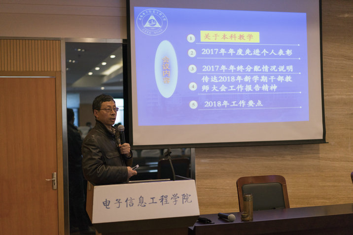 常务副院长周建江代表学院班子传达了学校新学期干部教师大会暨全面从严治党工作会议精神,带领大家学习了聂宏校长《改革创新 强化落实 全力推进学校各项事业健康快速发展》大会报告和杭育新全面从严治党的工作报告,全面回顾了学校2017年取得的成就,对2018年学校重点工作和全面从严治党要求进行了详细解读。在传达学校报告的同时,周院长还穿插总结了学院2017年成绩和不足,部署了学院2018年工作要点。2017年,在全院师生共同努力下,学院新增国家百千万人才工程1名,第三批国家“万人计划”教学名师1名,科技创新领军人才1名;新增1个国防特色学科,新增1个工信部重点实验室,获中国通信学会科学技术奖一等奖1项,国防科技进步三等奖1项,江苏省教学成果二等奖1项,“挑战杯”特等奖和二等奖各1项,全年科研经费到款总额突破4000万元,较去年增长43.86%。2018年,学院要围绕师资队伍和学科建设、创新人才培养、科研工作、党建工作等方面继续努力,尤其要大力做好本科西汉姆联,制定和完善学院关于西汉姆联的刚性规章制度,周院长号召全体老师要以高度的责任心认真做好这项“良心”工作,要求教师党员发挥模范作用,带头做好本科西汉姆联。周院长还汇报了2017年学院年终分配情况,宣读了2017年度先进个人表彰,通报了1项教学事件。