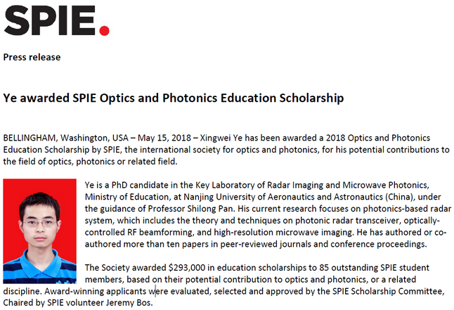 近日,2018年度国际光学工程学会光学与光子学教育奖学金(SPIE Optics & Photonics Education Scholarship)评选结果揭晓,我校雷达成像与微波光子技术教育部重点实验室在读博士生叶星炜同学荣获该奖项。此次奖学金共授予85位获奖者,其中国内仅有两个人获奖,分别是清华大学的郭强(音)和西汉姆联的叶星炜。