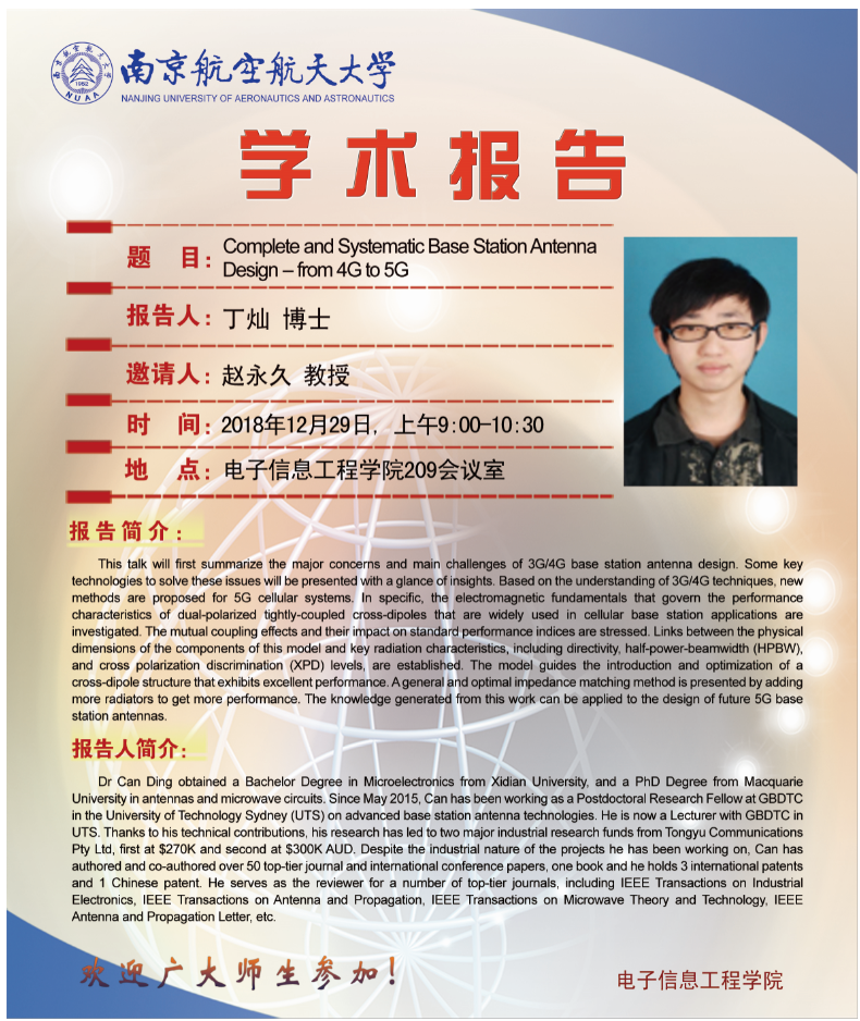 学术报告会——Complete and Systematic Base Station Antenna Design-from 4G to 5G