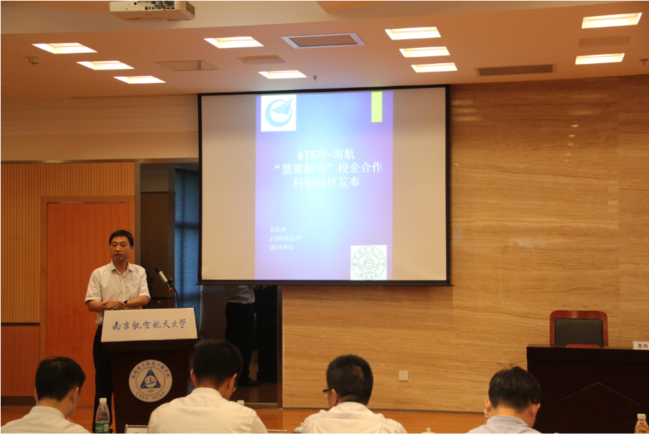 施大宁首先对615所的到来表示诚挚的欢迎。他表示,南航自身的发展一直秉承“注重基础研究,注重特色发展”,南航的发展也离不开分布在包括615所在内的国家重大攻关领域和行业前沿的优秀校友的助力。他指出,当前高等教育正处于改革开放的新时代,也是科技革命带来的新经济挑战的新时代,因而要对人才培养提出新的要求,需要结合“新工科”的办学理念,打破学科的边界和校园的边界,思考校企协同育人,共同跨界培养综合能力强、具有开拓精神和创新能力、能应对新经济时代特别是智能时代的人才。他强调,南航与615所之间存在着优势互补的关系,双方的合作能够加速产学研无缝对接,帮助学生在实践中培养创新精神。此外,学校将做好各项保障工作,为项目的培育提供良好的环境,他希望所有参与的企业导师、教师以及同学都能充分利用校企合作平台,发挥聪明才智,尽情展露才华。