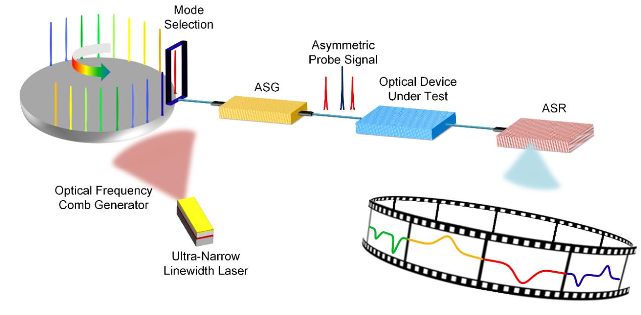 光器件是实现新一代光信息系统(光通信、光传感、光处理、量子计算等)的物理载体。光矢量分析方法作为一种能够测量光器件幅度、相位以及偏振响应的基础测量方法,对光器件的研制、生产、检测和应用有着极为重要的作用。不同的光器件对测量的要求也不同。比如,应用于量子存储的超高Q值光谐振器要求光矢量分析方法具有超高的频谱分辨率,大容量光通信所需的光纤类器件要求光矢量分析方法具有超宽的测量范围,而光处理所需的高精细可编程和非线性器件则要求光矢量分析方法具有足够的测量动态范围。