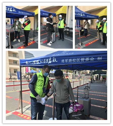 按照“错峰错时、分期分批”返校的开学要求,4月23日-26日,我校迎来了2020年春季学期首批返校学生。为了确保学生返校工作顺利开展,机关党委、将军路校区党工委、校团委组织相关单位150余名教职工,共同组建教职工志愿者团队,从早上7:30到晚上20:00,排班轮岗,每个班次连续工作六小时,负责秩序维护、体温检测、健康码核验、行李运送等志愿工作。学院积极响应学校倡议招募志愿者,经3个教工支部自愿报名产生,他们分别是一系的王祥传、黄正宇、甘慧、周芳老师,二系的吴迪、柳涛、夏伟杰、毕辉老师,机关的季娟、龚平、程永强、席维维、周贞琪老师。