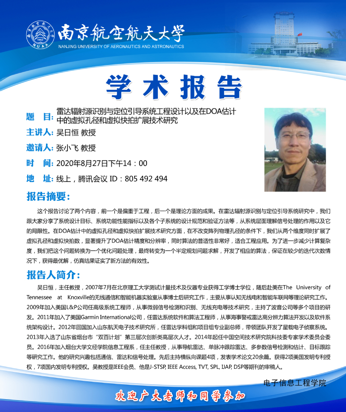 学术报告——雷达辐射源识别与定位引导系统工程设计以及在DOA估计中的虚拟孔径和虚拟快拍扩展技术研究