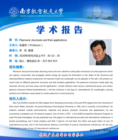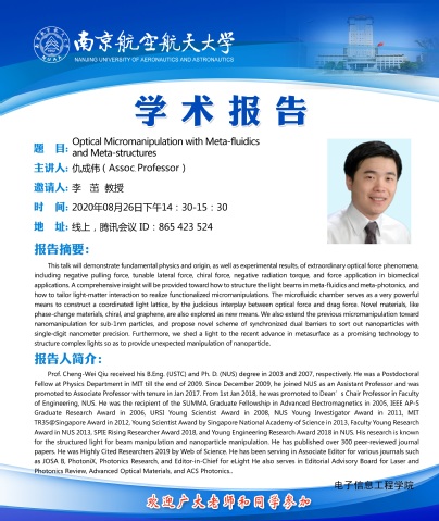 2020年8月26日,应学院李茁教授邀请,新加坡南洋理工大学及新加坡国立大学的四位知名教授将带来四场有关光学超材料和表面等离激元前沿理论及应用的精彩报告。以下为系列报告的报告主题和专家相关信息,报告以线上直播为主。