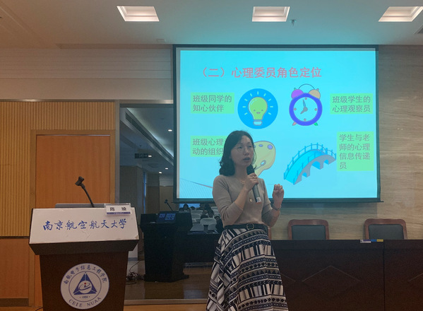 陈瑜老师简要介绍了学校心理委员会的成立背景,组织结构,工作地点,心理咨询预约方式等内容,并对学生心理气象员的工作内容,任职要求,助人技能等内容作了详细描述。针对结合近日多所高校相继发生的研究生自杀事件,陈瑜老师指出,随着科研及课业压力的增加,学生心理问题频发,心理气象员的工作也愈发重要。她强调心理气象员是班级同学的知心伙伴,也是老师和学生之间的信息传递员。心理气象员应该运用所学,培养自身观察和识别心理问题的能力,通过组织心理相关的课余活动加强同学之间的交流,并为同学们提供正确的心理援助渠道信息,做到“自助”和“助人”。