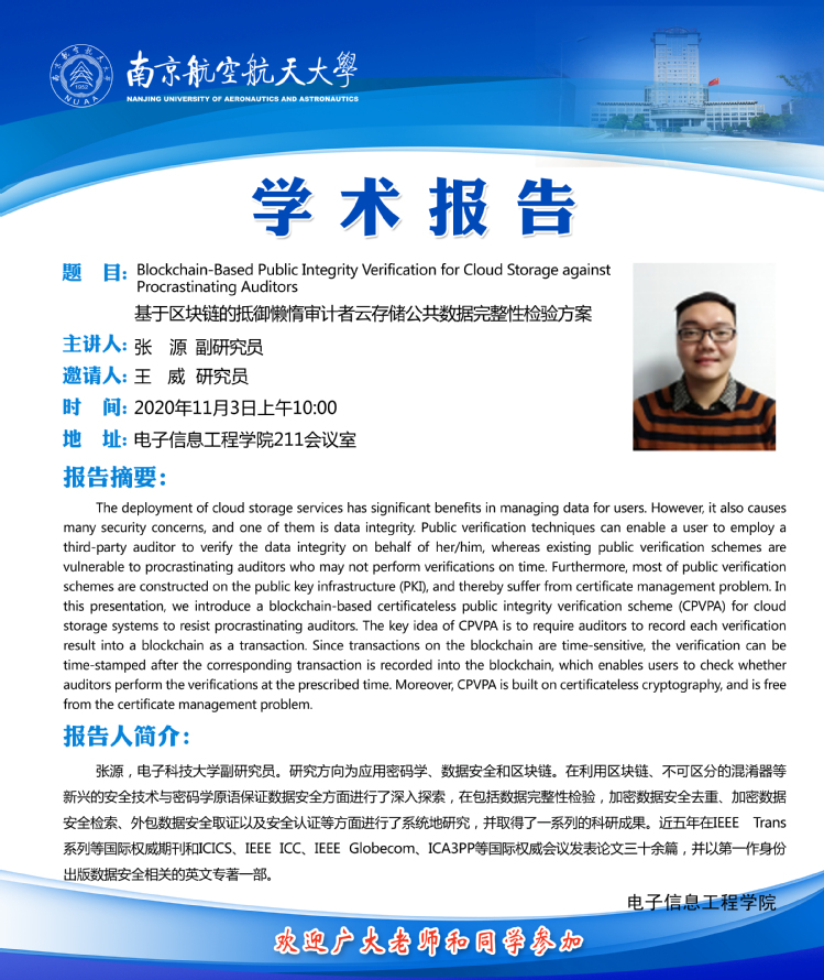 学术报告——基于区块链的抵御懒惰审计者云存储公共数据完整性检验方案