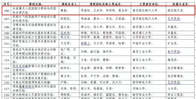 近日,国家教育部关于首批国家教育部关于首批国家一流本科课程认定结果的公示结束,我院雷磊教授、王成华教授、蔡圣所老师负责并参与的《多旋翼无人机装配与群体协同虚拟仿真实验》课程进入国家级一流本科课程认定名单。