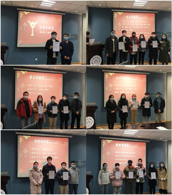 然后,会议进入颁奖环节,评优奖项包括综合贡献奖、项目贡献奖、学术贡献奖、公共贡献奖、团结协作奖、组织贡献奖,奖项覆盖了实验室50%以上同学。此次为实验室首次评优,意在表彰先进,激发同学们的科研积极性。