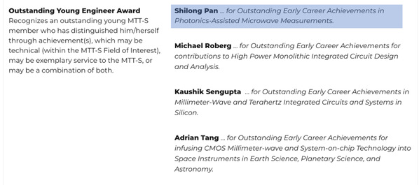 电气与电子工程师协会(Institute of Electrical and Electronics Engineers,IEEE)是目前全球最大的非营利性专业技术学会,共有会员42万人及39个分会。微波理论与技术协会(MTT-S)成立于1952年,是IEEE第5大协会。现有会员约有10万人,在全世界有190个分会。IEEE MTT-S 杰出青年工程师奖主要用于表彰在微波领域技术和社会服务方面做出杰出贡献的青年学者。评选内容包括论文、专利、学术活动以及对学术界、工业界的贡献等,每年不超过4人获此殊荣。
