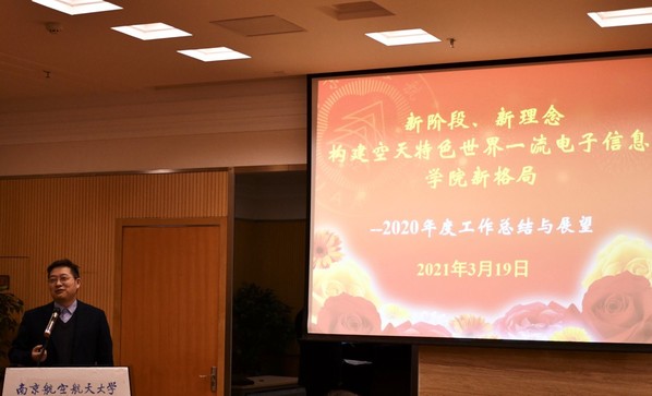 校长助理、学院常务副院长吴启晖以“新阶段 新理念 构建空天特色世界一流电子信息学院新格局”为题,以辩证思维从谋突破、守底线,KPI考核成绩优秀;谋高度、执低位,学科评估高质量完成;谋长远、行眼前,高水平教师队伍体系初步建立;谋全局、干一隅,四院工作全面开花四个方面,全面总结了学院2020年度工作,并对学院全年绩效分配及年终分配变化情况进行了分析说明,表彰了2020年度获评校院两级各类奖项的先进个人及集体。在对2021年的工作展望中,吴启晖强调,今年是建党100周年,“十四五”发展规划开局之年,站在国家新发展阶段的历史方位上,学院全体教职工要结合我校特色和学院实际,立足“建成学院小康”的新发展阶段,以“进攻是最好的防守”新理念,加快构建空天特色世界一流电子信息学院新格局。