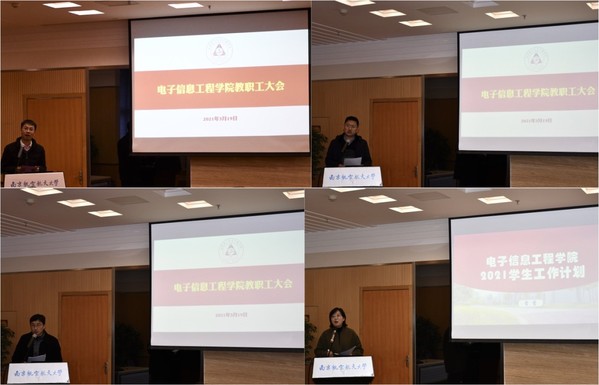 会上,学院副院长潘时龙、刘伟强、张小飞、学院党委副书记雷蕾分别就学院2020年度科研工作、研究生培养工作、国际合作交流工作、集成电路学科建设工作、本科生西汉姆联、学生教育管理工作等进行了深入系统地总结,并就2021年相关工作进行了部署。