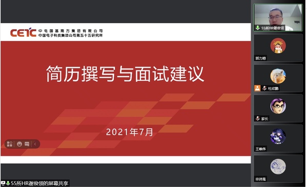 7月31日,学院针对学生国防类企业就业需求,邀请中国电子科技集团五十五所人力资源部谢俊领主管与学院准毕业班同学进行“国防类企业简历制作及面试技巧”线上交流分享。谢主管结合自身多年国防企业人力资源经验与同学们分享自身经验,从“基本信息”、“教育经历”、“亮点信息”等方面切入与同学们交流如何制作一份适合自己并能打动国防类企业HR的简历。同时与同学们交流在国防类企业面试时的注意事项,针对同学们的个性化特点阐述如何突出个人优势,鼓励同学们抓住国防行业的发展机会,投身国防事业。