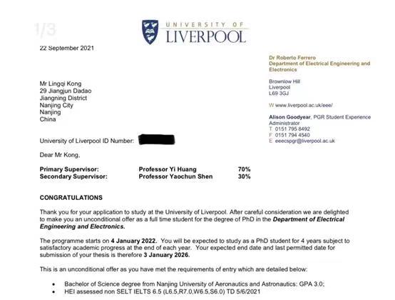 热烈祝贺我院EMULab实验室硕士研究生孔令奇获得英国利物浦大学博士录取通知书。