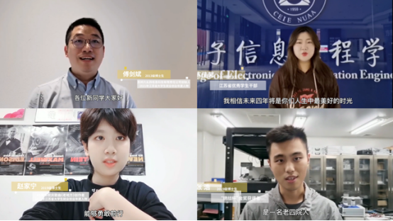江苏省大学生就业创业年度人物、我院2013级博士生傅剑斌,江苏省优秀学生干部、我院2018级博士生陈佳馨,以及“互联网+”金奖、“挑战杯”金奖、大学成就奖、十大杰出青年获得者等8名学生代表通过视频寄语新生,希望新生能够努力向优秀学长学姐看齐,多样发展,在南航、在四院遇见最不凡的自己。
