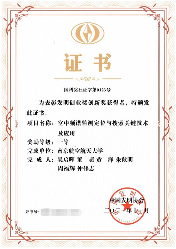 2021年11月,我校副校长吴启晖教授牵头、董超教授、黄洋副教授、朱秋明教授、周福辉教授与仲伟志副教授参与的项目“空中频谱监测定位与搜索关键技术及应用” 在中国发明协会2021年度“发明创业奖—创新奖”评选中获发明创业奖创新奖一等奖。
