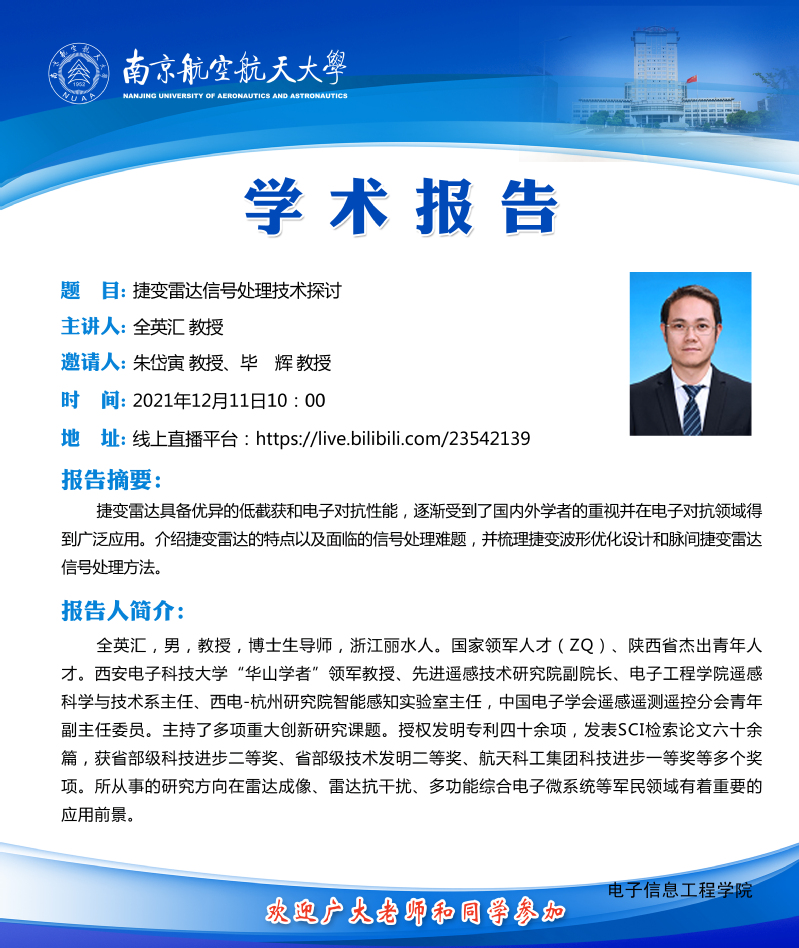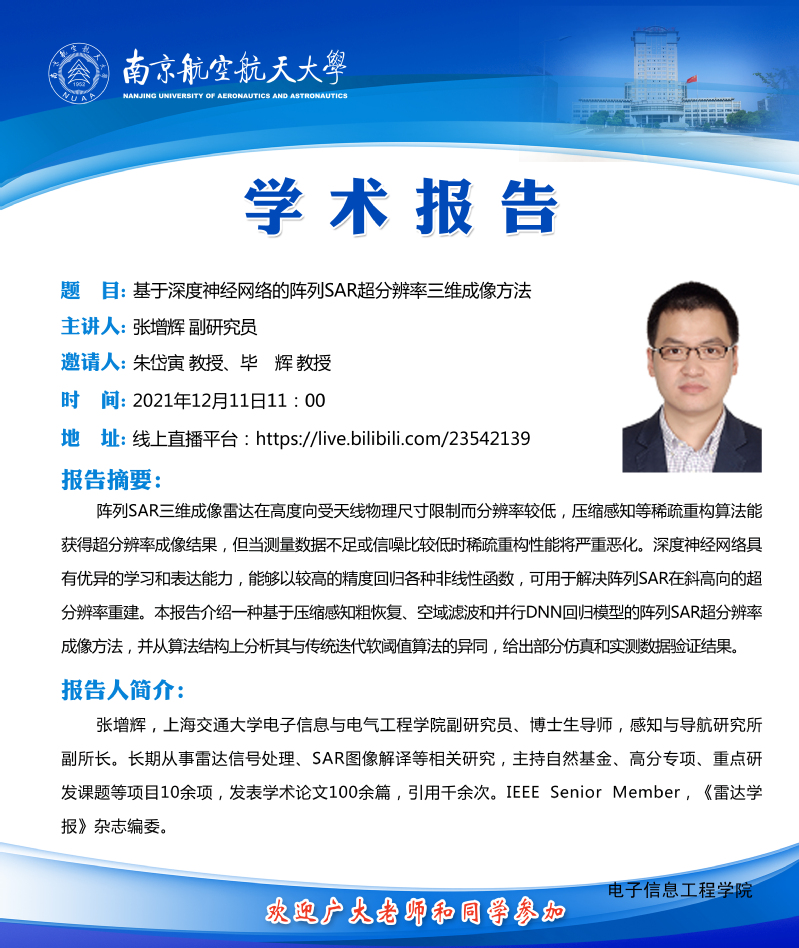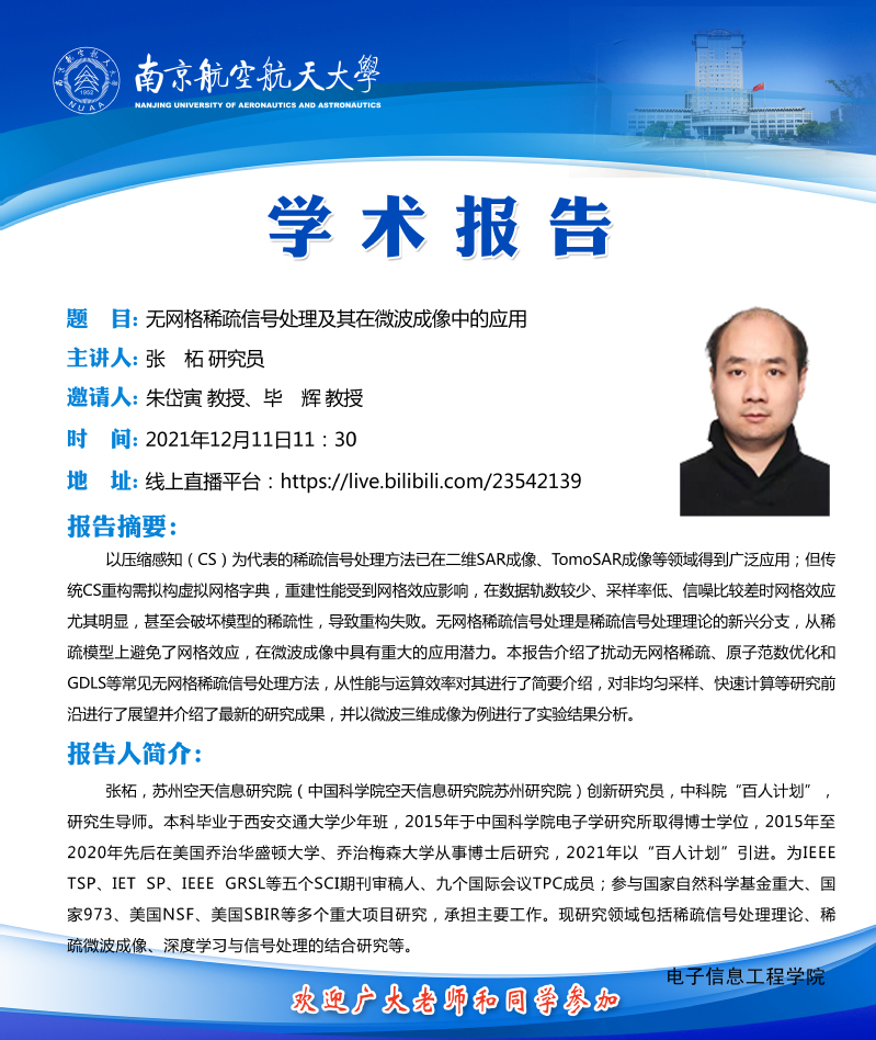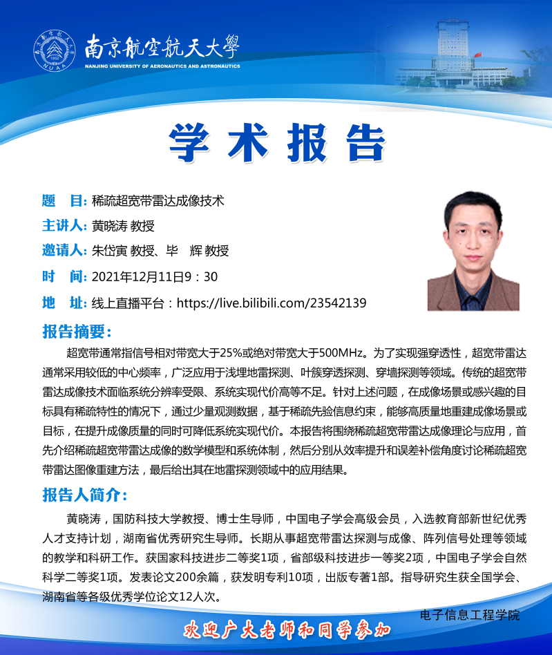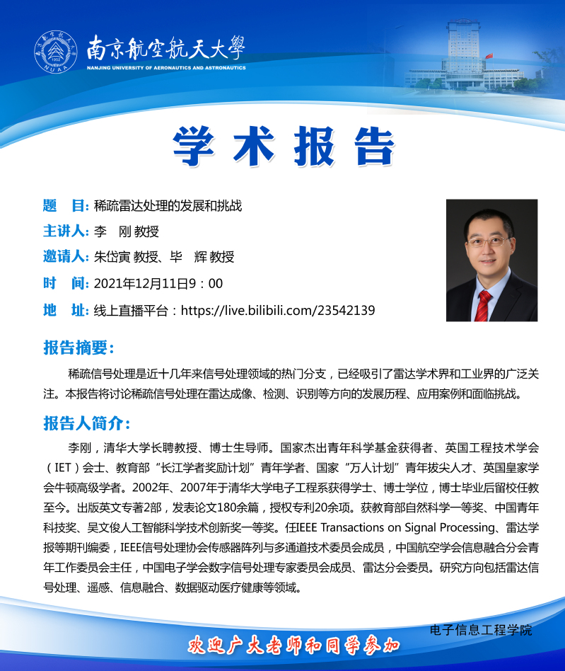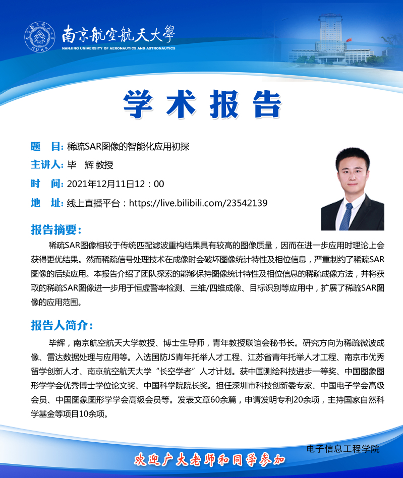 一、讲堂主题:当稀疏信号处理技术遇见雷达 作为目标探测的一种重要手段,雷达在军事、民用领域具有广泛的应用及发展前景,对国防安全、国土测绘、灾害预警等具有重要的意义与价值。稀疏信号处理技术提供了一种基于少量数实现信号精确恢复的方式,在信号处理领域具有一定的应用价值和意义。本次研讨会围绕稀疏信号处理技术在雷达不同方向的应用展开研讨,探讨基于稀疏信号处理的二维/三维 SAR 成像、目标检测与识别、系统设计等最新的理论突破与技术进展,推动促进新一代稀疏微波成像雷达系统的创新发展及多源应用。 二、时间方式:2021年12月11日9:00-11:40,雷达学报直播平台。三、主办单位:西汉姆联雷达成像与微波光子教育部重点实验室、雷达学报会议主席:朱岱寅、毕辉执行主席:张晶晶