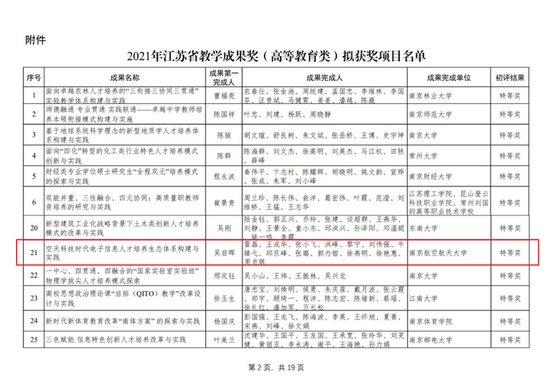 近日,江苏省教育厅公布了2021年江苏省教学成果奖(高等教育类)获奖项目名单,我院报送的教学成果“空天科技时代电子信息人才培养生态体系构建与实践”荣获江苏省教学成果奖特等奖。