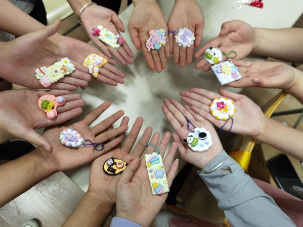 手作之美,在于创新与巧思。在奶油胶制作环节,同学们们充分地发挥想象力与创造力,将手中的材料使钥匙扣变成一件件色彩丰富、独具特色的作品。用色彩鲜艳的奶油胶轻轻打底,缀上各种可爱的装饰,妙趣横生。物化在手,心有万象。轻轻柔柔的奶油云朵,唤起端午佳节、仲夏时节的年轻悦动的气息。