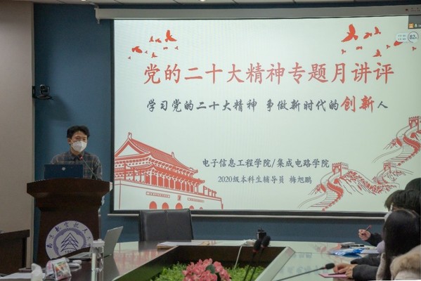 梅旭鹏领学了党的二十大报告中习近平总书记对高水平科技自立自强的重要论述,立足电子信息专业的学科特点,带领支部同志回顾电子信息技术发展的四个时期,学史悟思,明确电子信息学子的时代使命。