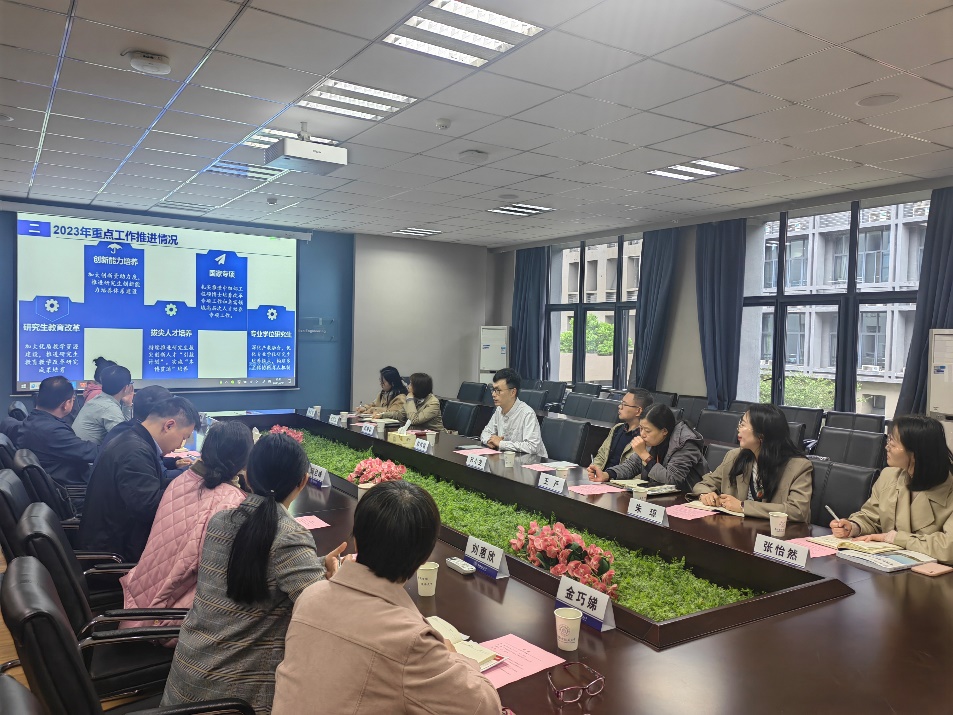 随后,郑祥明副院长从创新能力培养、培养体系完善、培养方案优化、课程质量提升、学分制改革、管理办法建设等方面,详细介绍了2023年度学校研究生培养和教育改革的重点工作。李茁副院长从学院研究生教学管理工作思路、具体举措与成效等方面详细汇报了学院近年来研究生培养工作的开展情况。