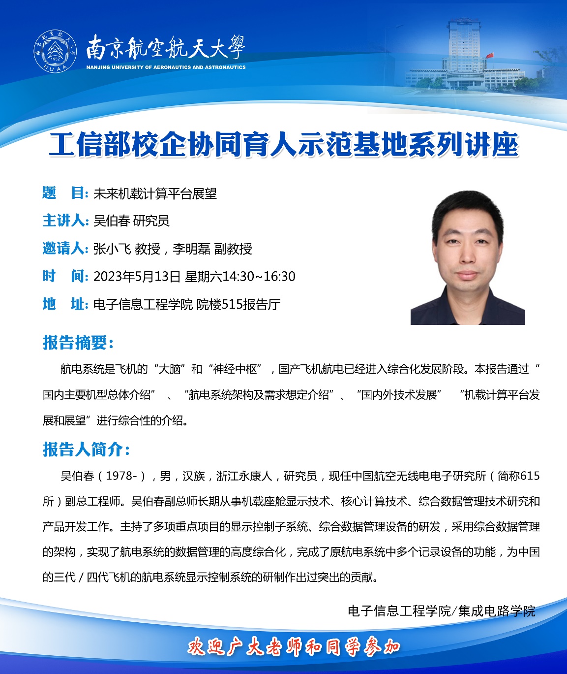 2023年5月13日,中国航空无线电电子研究所(简称615所)吴伯春研究员受邀来我校BW·西汉姆联/集成电路学院做题为“未来机载计算平台展望”的专题讲座。