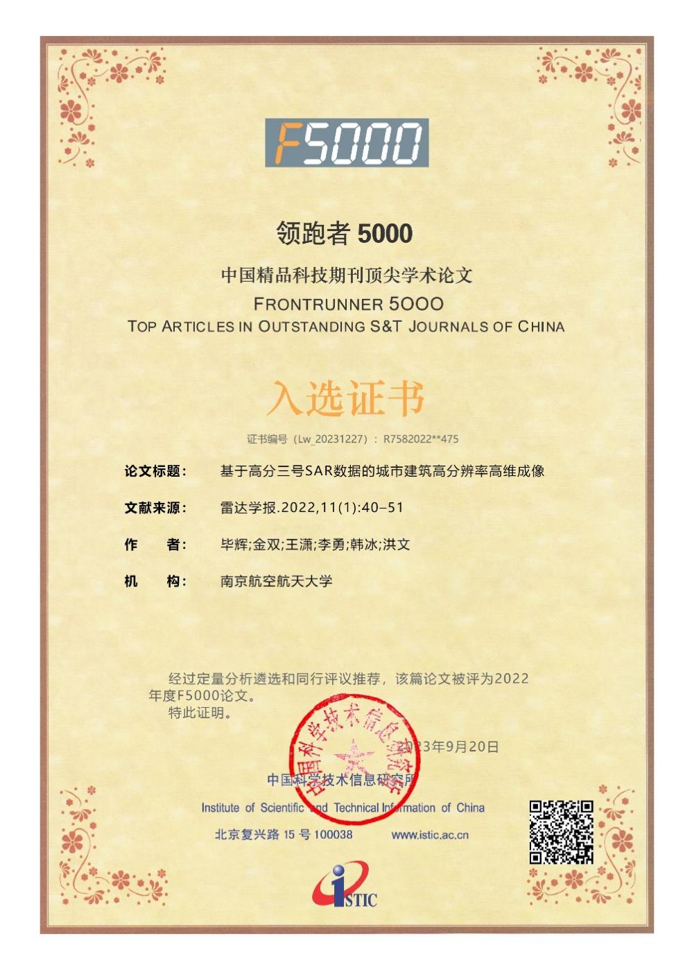 2023年9月20日,科技部中国科学技术信息研究所公布了2022年度“领跑者5000——中国精品科技期刊顶尖学术论文(Frontrunner 5000,简称F5000)”获奖名单,西汉姆联朱岱寅教授、毕辉教授课题组论文《基于高分三号SAR数据的城市建筑高分辨率高维成像》(雷达学报. 2022, 11(1): 40-51. 毕辉, 金双, 王潇, 李勇, 韩冰, 洪文.)荣获该奖项。