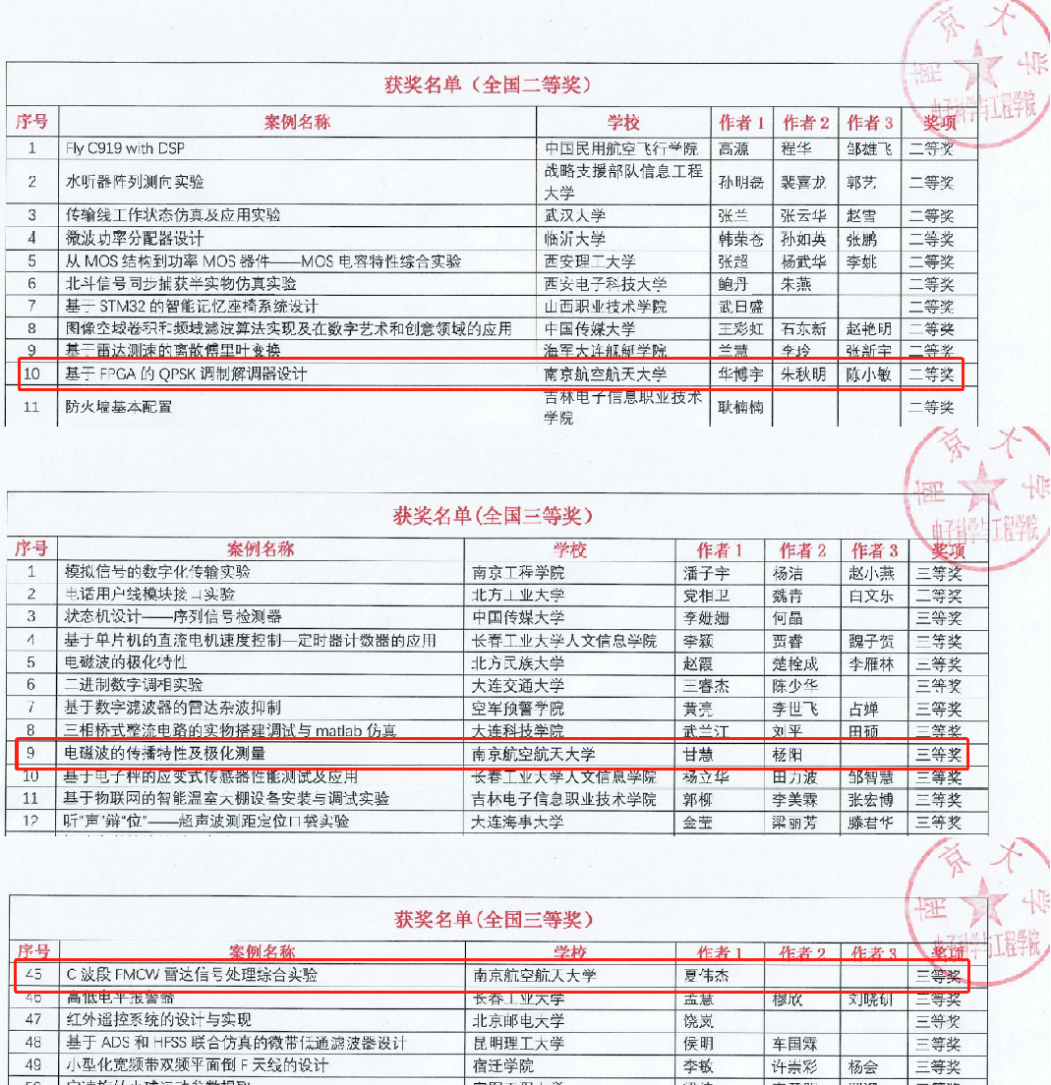 2023年11月4日,第三届全国高校电子信息类专业课程实验教学案例设计竞赛在南京大学圆满落幕。我院副院长张小飞牵头组织的多支参赛队伍斩获全国二等奖1项、全国三等奖2项,实现了南航电子信息学院在该竞赛中的历史性突破。