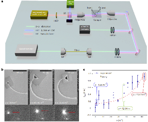 图1 a.实验光路图。基频光源使用了可调波长飞秒激光器和稳态光源。b. 不同梯度曲率的加速波导样品的电镜图片和与之对应的CMOS成像图。从三幅子图中的光强对比可以看出,曲率梯度(加速度)越大,光强越大。c.和频光光强随曲率梯度的变化关系。其中红线表示理论结果,蓝点和误差线分别表示多次实验测试结果的平均值和方差。