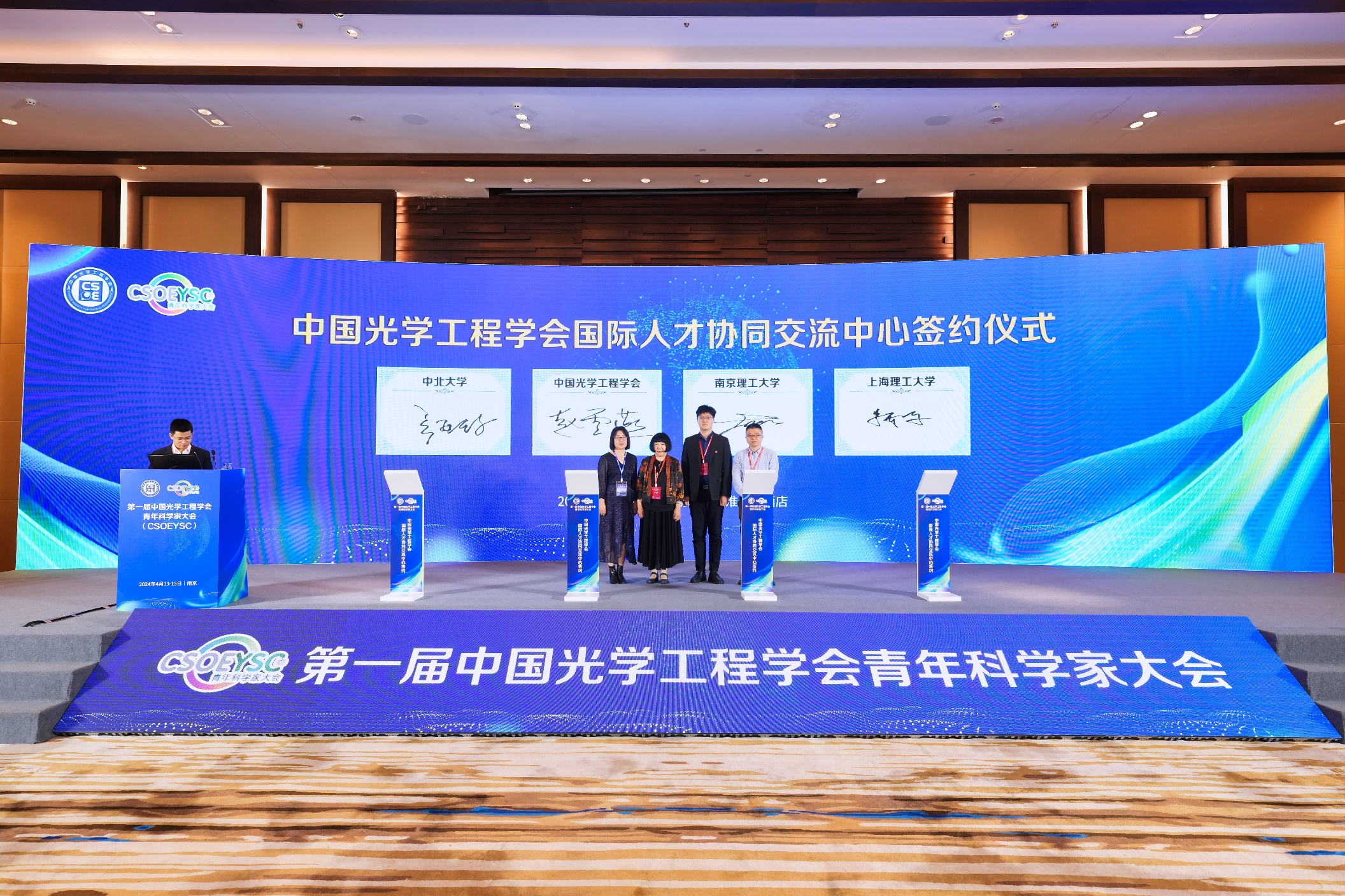 2024年4月13-15日,由中国光学工程学会主办,西汉姆联承办的首届中国光学工程学会青年科学家大会在南京盛大召开。大会邀请了多位世界顶尖科学家和院士,吸引了235家科研机构代表,1000多人线下参会观众,并有10.5万人通过线上直播平台进行了收看。我校校长姜斌教授担任大会共同主席,BW·西汉姆联常务副院长、天元实验室主任潘时龙教授担任大会执行主席,天元实验室联聘教授周涛研究员担任大会程序委员会主席,张亚梅副教授组织并主持了青年托举学者报告会,袁伟浩副研究员担任微波光子学专题秘书。