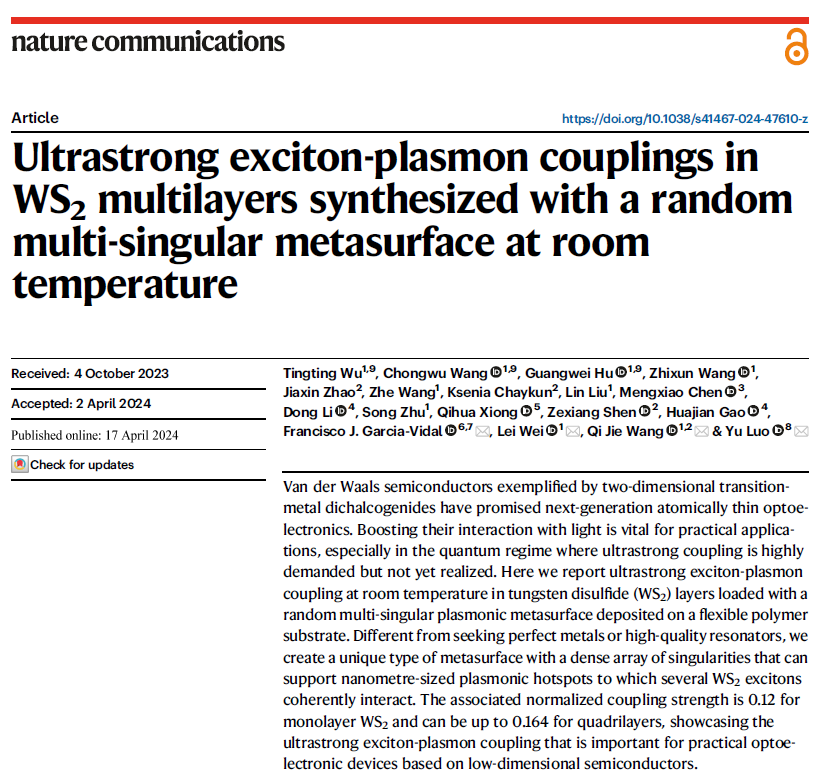 近日,我校微波光子国家级重点实验室(天元实验室)罗宇教授联合南洋理工大学王岐捷教授、魏磊教授课题组,以及马德里自治大学Francisco J. Garcia-Vidal教授课题组,在《Nature Communications》上发表题为“Ultrastrong exciton-plasmon couplings in WS2 multilayers synthesized with a random multi-singular metasurface at room temperature”的学术论文。该研究首次成功实现了室温条件下二维材料激子与金属超表面等离子激元之间的超强耦合,并且仅通过施加应力实现了激子-等离子激元耦合强度的大范围调控。实验室罗宇教授和南洋理工大学王岐捷教授、魏磊教授、马德里自治大学Francisco J. Garcia-Vidal教授为论文共同通讯作者。