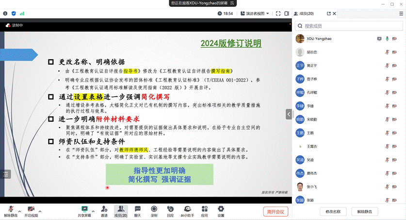 李勇朝从工程教育专业认证自评报告的撰写要求及标准的变化出发,对22版指导书及24版指南的修订情况进行比较说明,为参会教师介绍了当前自评报告的撰写理念,并从学生、培养目标、毕业要求、持续改进、课程体系、师资队伍和支持条件等7个自评报告重要组成部分着手,详细讲解了各部分撰写的重点与注意点。他强调了研读撰写指南、领会指南内涵的重要性,并指出当前的专业认证自评报告大幅简化了撰写内容,是否实质性地开展了相应工作、是否做了持续改进是重要关注点。