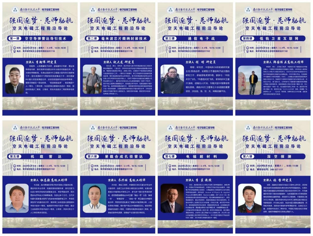 课程聚焦于空天雷达与通信工程背景下电子信息技术发展前沿,构建了空天雷达工程、空天通信工程和相关前沿新技术三个知识模块,邀请了上海雷骥电子总师李朝伟、航天科技704所研究员祝大龙、中国电科36所研究员程明、中国电科网络通信研究院副总工韩国栋、扬州赛瑞航电副总经理杜志毅、中国电科38所天基SAR副总师乔兴旺、国家航天局探月与航天工程中心研究员张哲等航空、航天和电子领域的资深专家与李茁副院长等校内教师共同参与课堂教学和课程建设。专家们在课程准备和讲授中投入了极大的热情,分别围绕空空导弹雷达导引技术、机载火控雷达技术、星载合成孔径雷达系统设计、低轨卫星互联网工程及相控阵天线技术、深空探测工程、通信电子战、毫米波化合物芯片微纳封装技术和电磁超材料等空天雷达与通信工程中的基础知识和前沿技术,为同学们进行了深入浅出地讲解,并开展了面对面的研讨。