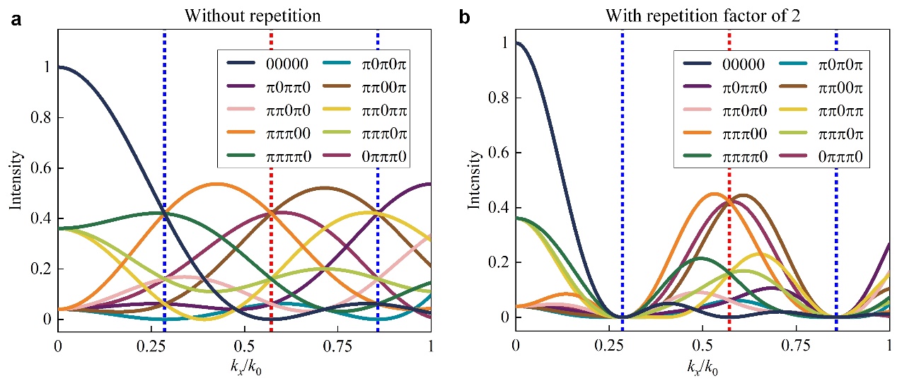 当引入周期编码后,远场方向图的峰值将集中于整数阶谐波方向,因而可使系统在整数阶谐波处具备更高的能量转换效率。