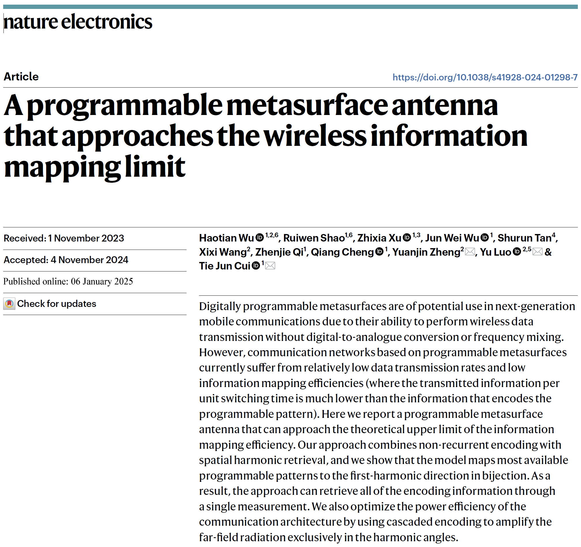 近日,我校BW·西汉姆联罗宇教授团队联合东南大学崔铁军院士和新加坡南洋理工大学郑元谨教授在《Nature Electronics》上发表了一项突破性研究成果,提出了一种接近信息映射效率理论上限的可编程超表面天线。该技术通过非周期编码和空间谐波测量,实现了高效的信息映射,为下一代移动通信技术的发展提供了新的可能性。崔铁军院士、罗宇教授和郑元谨教授为该论文的通讯作者;东南大学博士毕业生吴浩天(现任南洋理工大学博士后研究员)和东南大学博士生邵睿文为论文的共同第一作者。