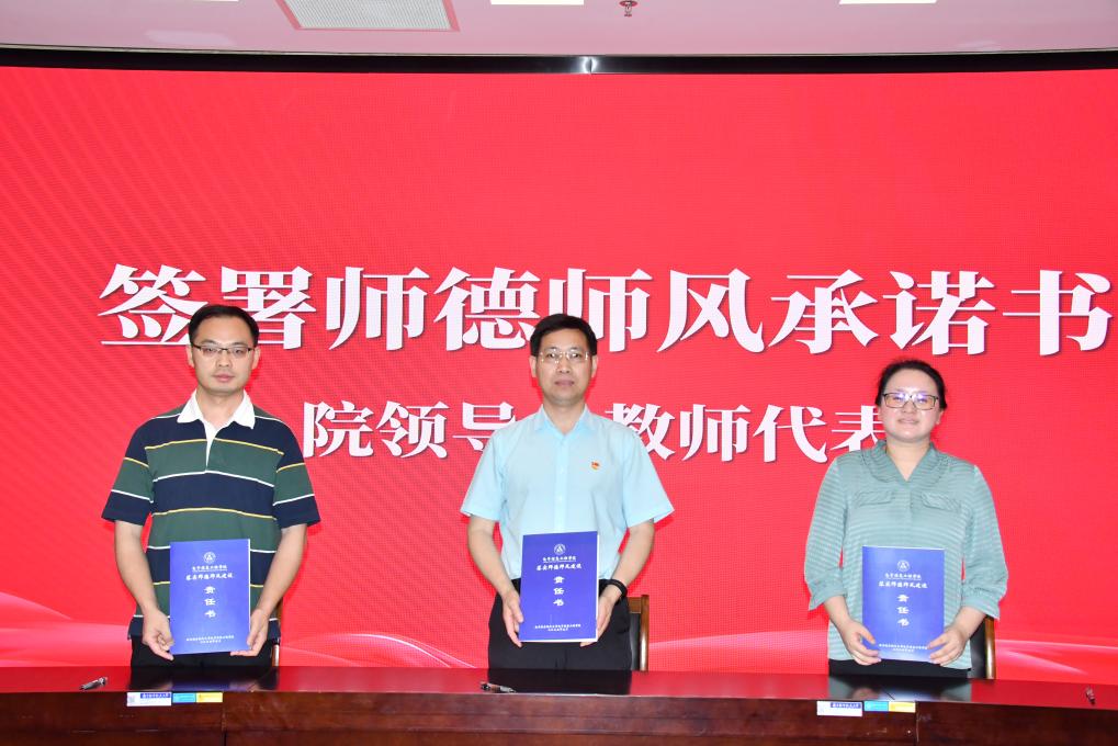 会后,进行了师德师风责任书的签订,院党委书记季海群代表学院与教师代表朱丹、时晨光现场签订了责任书,通过责任书的签订,进一步筑牢了师德师风建设的坚实防线。