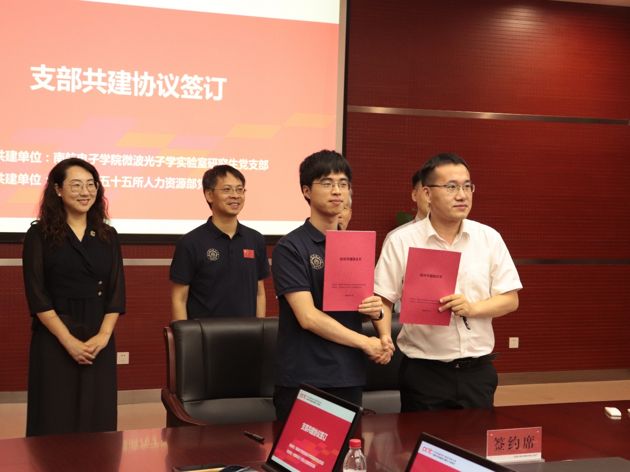 下午,团队到访中国电科55所,聚焦第三代半导体、微波功率器件与微波光子器件研发。在微波功率器件与微组件工艺线洁净车间,师生们近距离观察了高性能微波芯片的制造流程。55所专家介绍了55所在第一、二、三代半导体及新一代半导体领域的自主发展体系。这些核心芯片和关键元器件已广泛应用于各种装备中,成为国防现代化和网络强国的重要支撑。双方就微波光子技术在未来6G通信等领域的应用进行了交流。微波光子学实验室研究生党支部还与中国电科55所人力资源部党支部签订了支部结对共建协议,双方将立足产教融合新趋势,全方位提升战略合作,促进党建业务深度融合,充分发挥党建价值创造力,共同推动人才高质量联合培养。