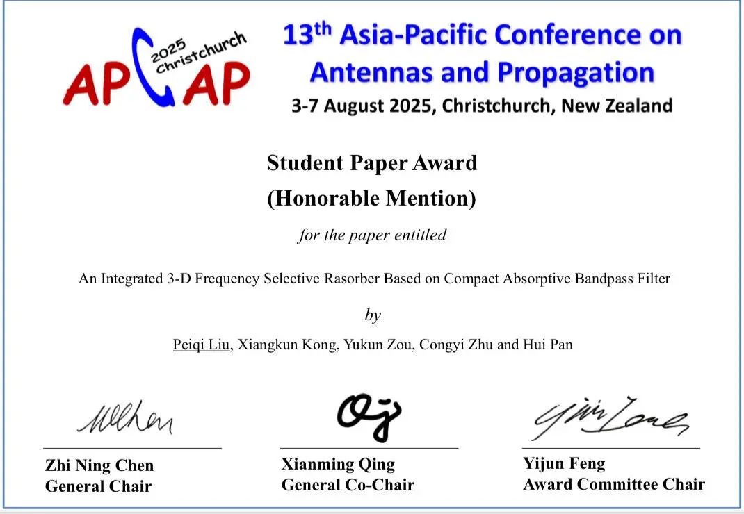 电磁隐身与智能结构课题组博士生刘沛淇的研究成果从众多竞争者中脱颖而出,荣获大会最佳学生论文奖!该奖项竞争激烈,全球范围内仅评选出8篇优秀论文。评选委员会由中国南京大学冯一军教授,英国利物浦大学黄漪教授以及沙特阿拉伯阿卜杜拉国王科技大学Atif Shamim教授三位全球顶尖科学家组成,现场对参赛作品要求严格,问题刁钻。该项殊荣不仅是对刘沛淇个人科研能力的顶尖认可,更是实验室在电磁隐身前沿领域国际影响力的有力证明!