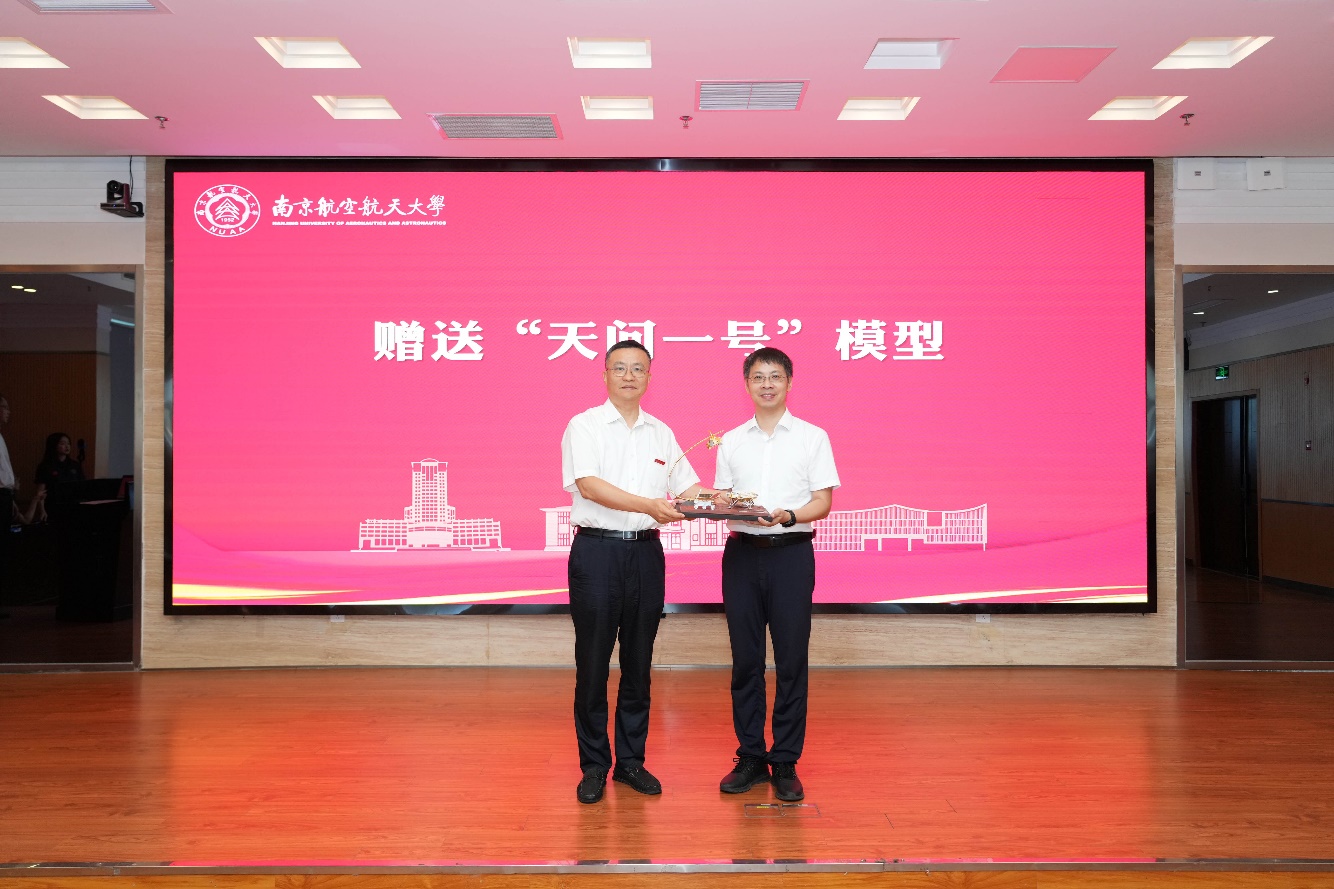 仪式大会中,姜斌为孙泽洲颁发BW·西汉姆联院长聘书,并为其佩戴校徽。孙泽洲向学院赠送天问一号火星探测器模型,校长助理、BW·西汉姆联常务副院长潘时龙代表学院接受这份承载着航天荣耀与校友深情的礼物。