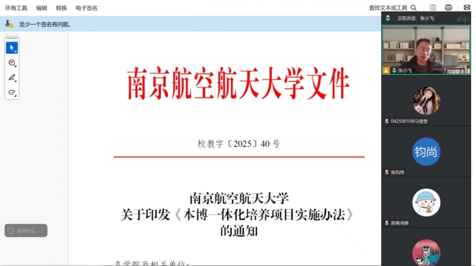 会上,张小飞围绕学校新近印发的《本博一体化培养项目实施办法》(校教字〔2025〕40号)文件核心内容,结合电子信息学科特色,从项目定位、培养模式、考核标准、导师制度和政策保障等关键板块展开详细解读,重点阐释了“3+1+X”的一体化培养体系;针对学生高度关注的考核调整机制,详细解读了本科学籍阶段学年综合考核的具体要求,引导学生树立清晰的学业奋斗方向。