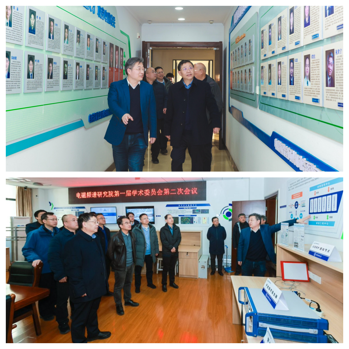 在参观环节,吴启晖带领学术委员会委员与特邀专家听取了研究院6个创新中心的汇报,通过实物与视频展示、展板介绍等多种形式,6位创新中心主任全面展示了研究院在认知智能、认知安全、认知网络、认知射频、认知孪生、认知定位6个方向的研究成果,领导与专家对研究院成果的创新性与应用价值给予了高度评价,并结合实际应用场景就成果落地应用提出针对性建议。
