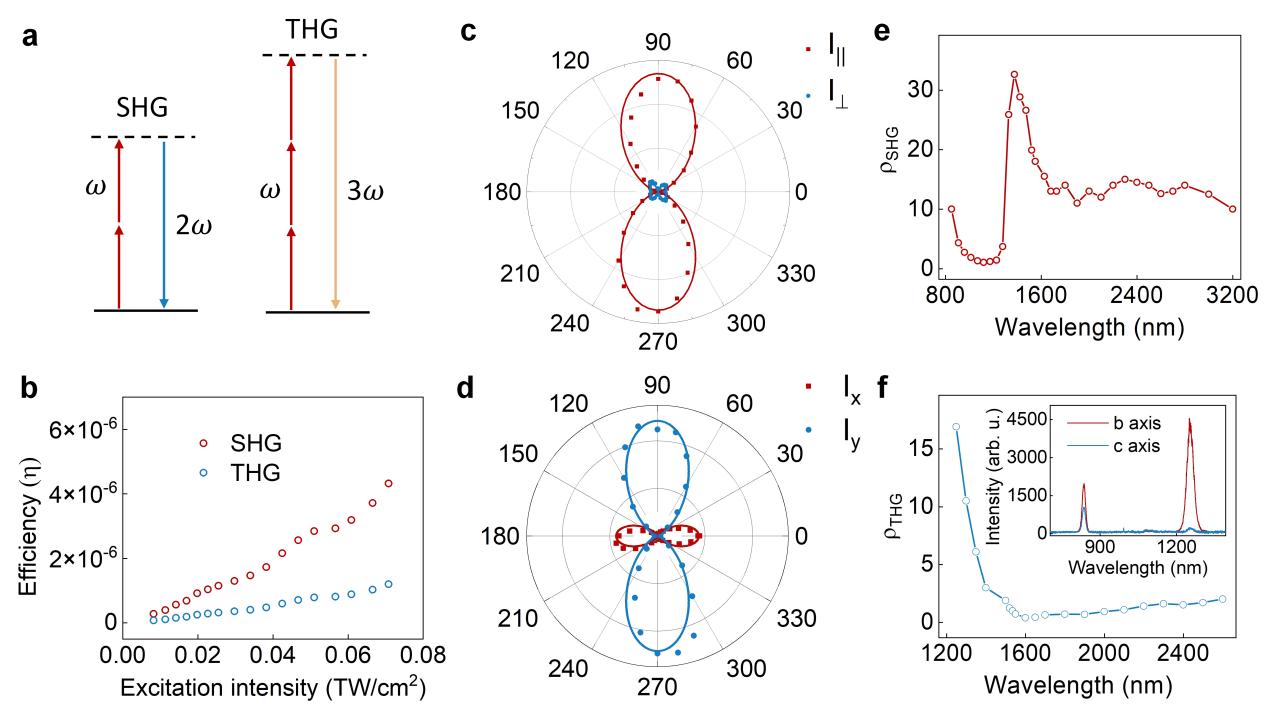 图2 NbOI₂晶体中的各向异性二次谐波(SHG)与三次谐波(THG)过程。